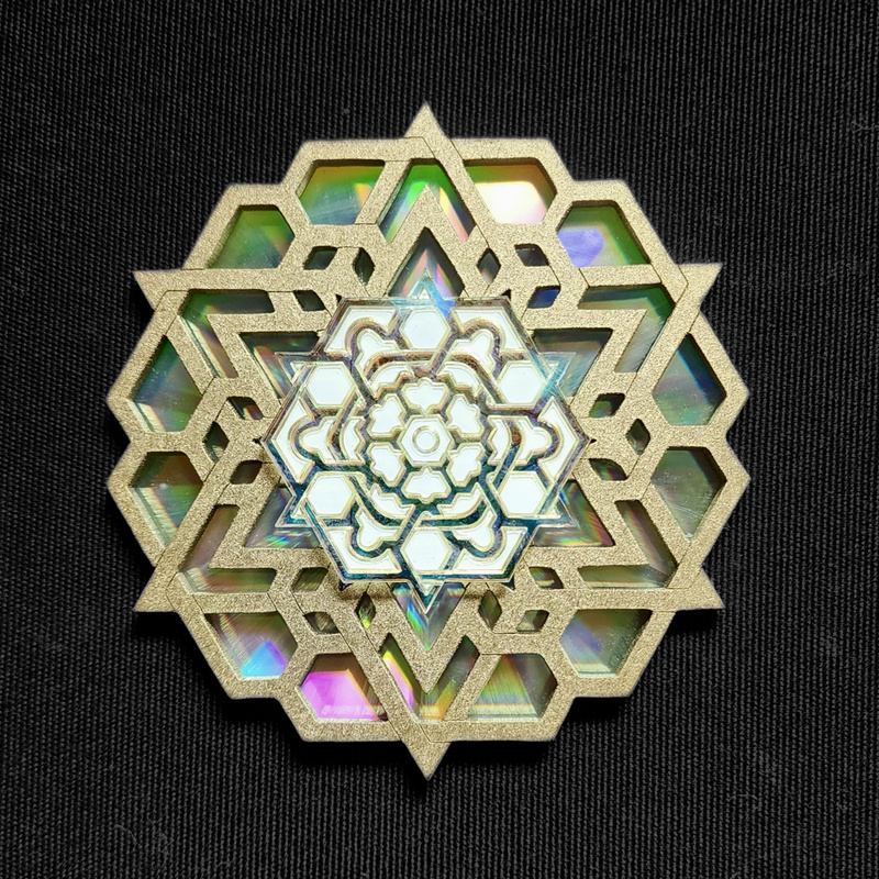 All original designs meditatively hand-drawn, translated into digital form and lasercut by the artist herself. A combination of sustainably sourced materials including fibreboard, acrylic and compact discs, painted, stained or varnished and glued together in unique combinations. They have lacunas at the back which provide an easy way to hang up on your wall, or alternatively thread your choice of rope or chain through to suspend.
