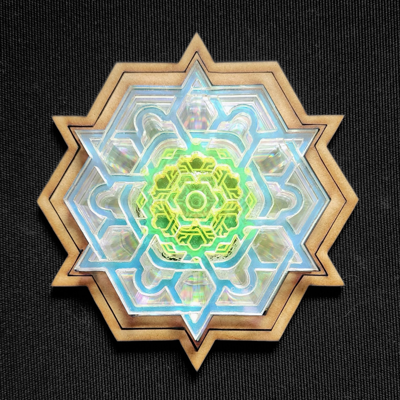 All original designs meditatively hand-drawn, translated into digital form and lasercut by the artist herself. A combination of sustainably sourced materials including fibreboard, acrylic and compact discs, painted, stained or varnished and glued together in unique combinations. They have lacunas at the back which provide an easy way to hang up on your wall, or alternatively thread your choice of rope or chain through to suspend.