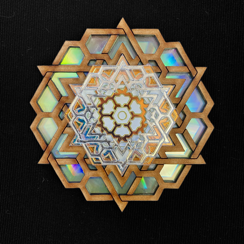 All original designs meditatively hand-drawn, translated into digital form and lasercut by the artist herself. A combination of sustainably sourced materials including fibreboard, acrylic and compact discs, painted, stained or varnished and glued together in unique combinations. They have lacunas at the back which provide an easy way to hang up on your wall, or alternatively thread your choice of rope or chain through to suspend.